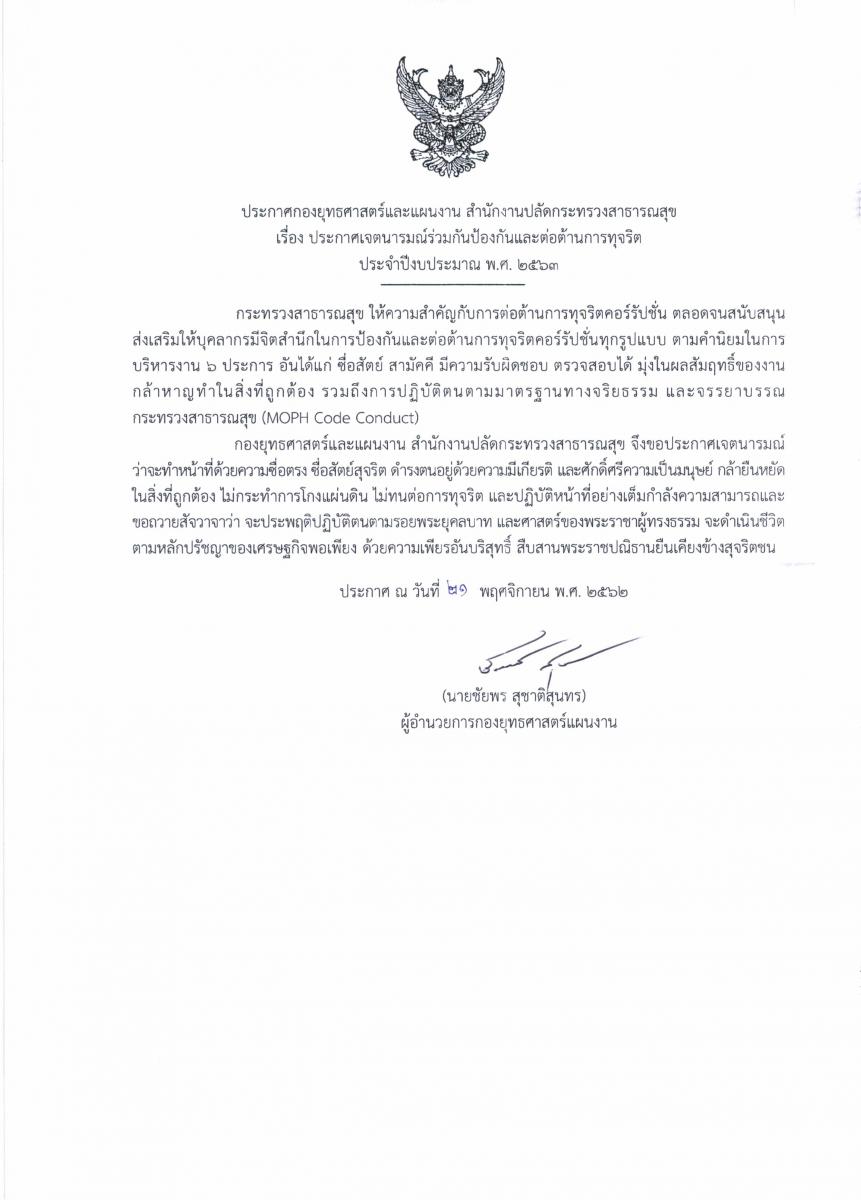 เรื่อง ประกาศเจตนารมณ์ร่วมป้องกันและต่อต้านการทุจริต ประจำปีงบประมาณ พ.ศ. 256326/4/65