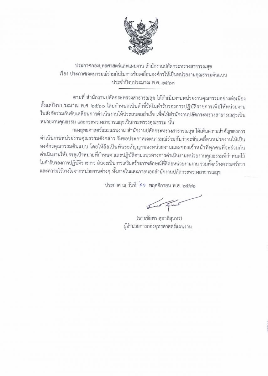 เรื่อง ประกาศเจตนารมณ์ร่วมกันในการขับเคลื่อนองค์กรให้เป็นหน่วยงานคุณธรรมต้นแบบ ประจำปีงบประมาณ พ.ศ. 256326/4/65